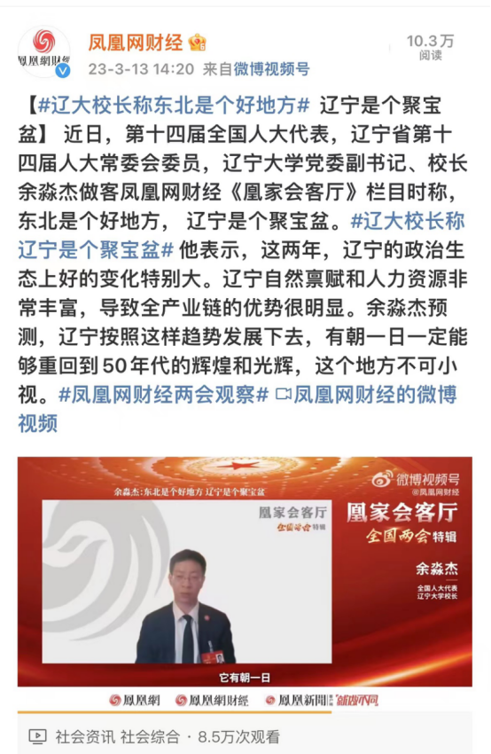 近日,第十四届全国人大代表,辽宁省第十四届人大常委会委员,365英国上市官方网站党委副书记、校长余淼杰做客凤凰网财经《凰家会客厅》栏目时称,东北是个好地方,辽宁是个聚宝盆。他表示,这两年,辽宁的政治生态上好的变化特别大。辽宁自然禀赋和人力资源非常丰富,导致全产业链的优势很明显。余淼杰预测,辽宁按照这样趋势发展下去,有朝一日一定能够重回到50年代的辉煌和光辉,这个地方不可小视。