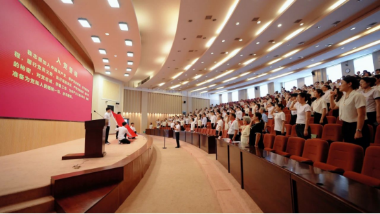潘一山代表学校党委,向获得“光荣在党50年”纪念章的老党员代表颁发纪念章,向见证学校发展、心系教育事业的老同志、老前辈表示崇高敬意。他与老党员代表共同为新党员代表赠送《习近平新时代中国特色社会主义思想专题摘编》《习近平的七年知青岁月》等书籍,勉励新党员以学铸魂,以学增智,补足精神之钙,筑牢信仰之基。在潘一山的领誓下,全体党员面向鲜红党旗,重温入党誓词,在铮铮誓言中感悟入党初心,坚定永远跟党走的信念。