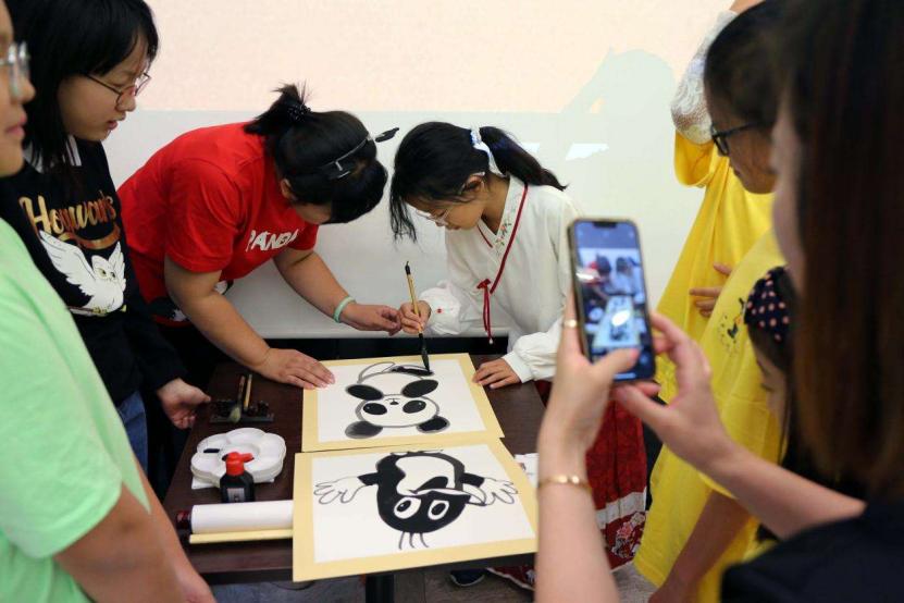 小营员现场体验绘画中国熊猫和捷克鼹鼠。杨艺明摄/光明图片