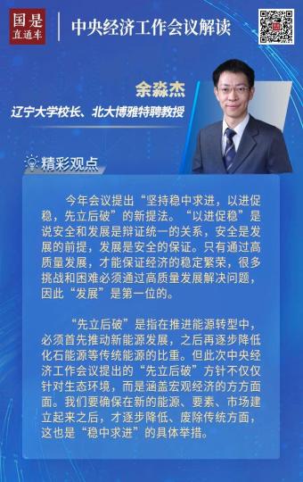 今年中央经济工作会议依旧“稳”字当头,提出“坚持稳中求进,以进促稳,先立后破”。余淼杰分析指出,“以进促稳”强调了安全和发展的辩证统一关系,安全是发展的前提,发展是安全的保证。只有通过高质量发展,才能保证经济的稳定繁荣,很多挑战和困难必须通过高质量发展解决,因此“发展”是第一位的。