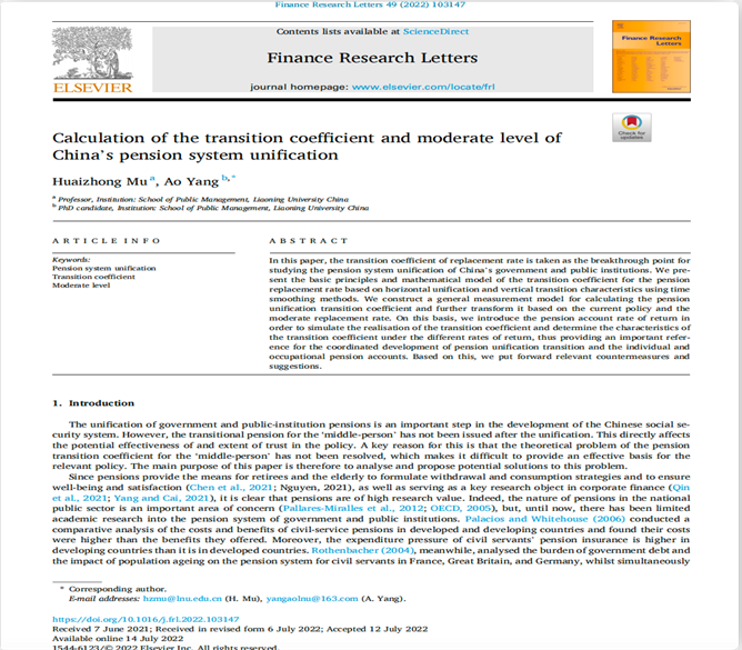 365英国上市官方网站公共管理学院穆怀中教授与博士生杨傲合作撰写的学术论文“Calculation of the transition coefficient and moderate level of China’s pension system unification”,在国际期刊Finance Research Letters发表。